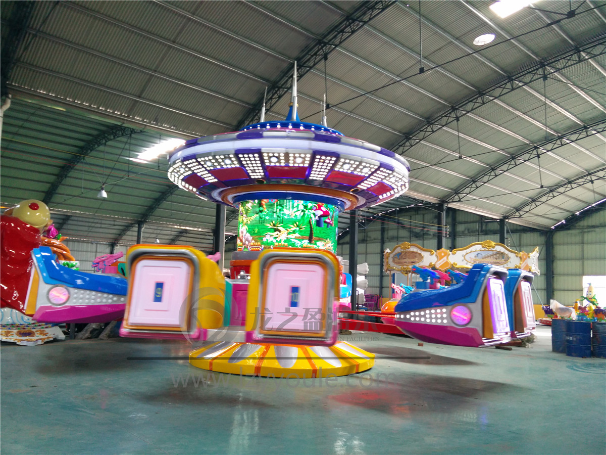 對于神秘的事物孩子總是會比已經經過社會現實科技打磨過的成年人們要多些向往和想象空間。星際明航自控飛機是一款適合2-7歲兒童及親子玩耍的游樂設備。機臺整個依據星際迷航影片中外太空空間站為主題形象,外形設計的十分貼近影片造型,星際迷航的座椅跟承重臂有十分符合主題,以迷你飛船為造型設計出各種吸引孩子的五彩色彩,座機上裝有紅外裝置的機槍設置,以各機艙間的槍擊對象數量為賽績進行排名。這種高互動的游樂效果技能提升孩子游樂的真實感和豐富度。